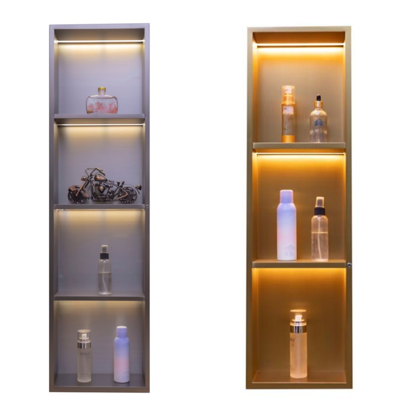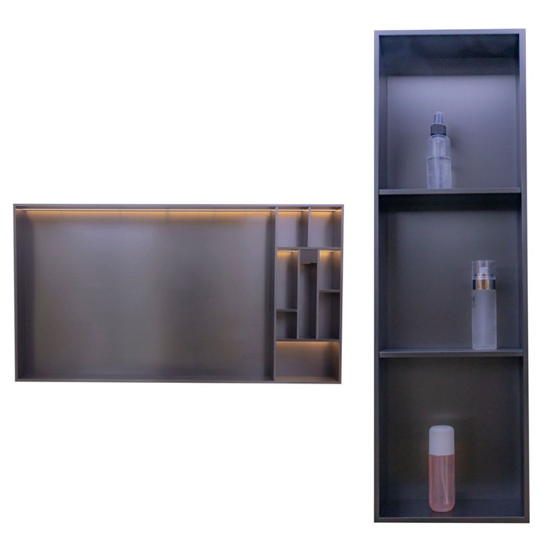 不锈钢壁龛可作为放置“装饰品”的空间,在暗藏光的映照下,衬托出陈列品的魅力。除此之外,壁龛还能通过组合排列,变化出多种样貌,自成一个漂亮的壁饰。那么,多元化的色彩选择是必不可少的。唐王壁龛有常见的四种电镀色可选,即拉丝玫瑰金、拉丝钛金、拉丝枪灰、拉丝枪黑。通过多元化的色彩选择,用不同色彩构筑和诠释每位业主的精致生活,让卫浴空间出众而不同。