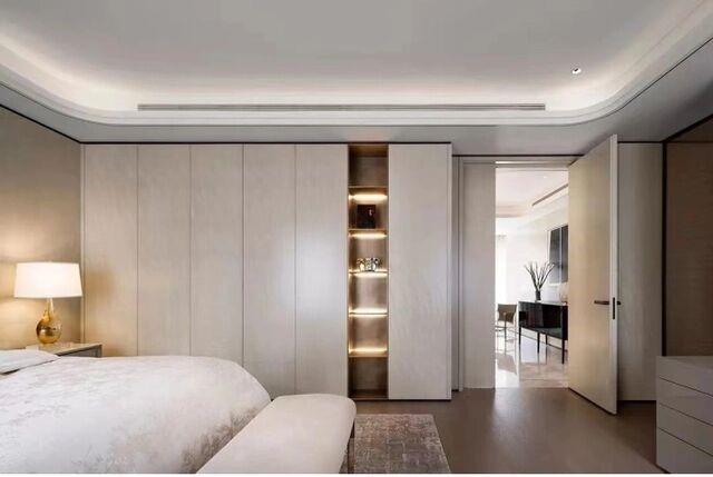 床头位置设计唐王不锈钢壁龛可以充当床头柜,摆放一些日常物品,相比起传统的床头柜,壁龛设计看起来更加简洁。