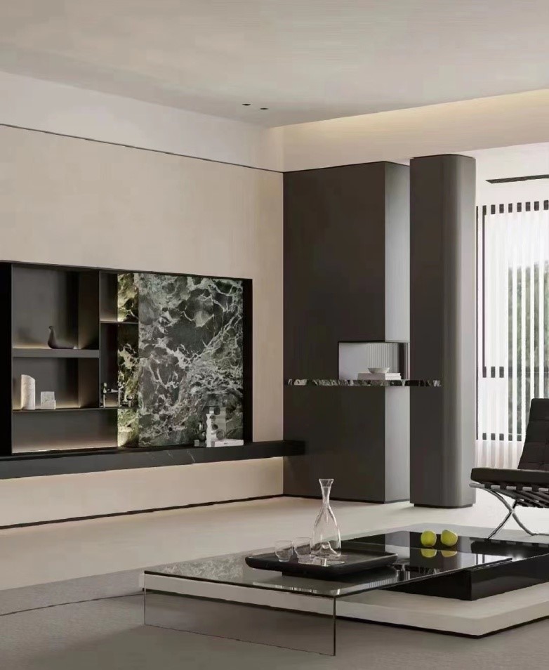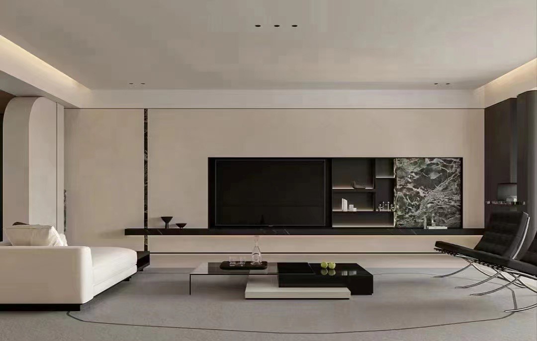 客厅装修唐王不锈钢壁龛一般设计在电视背景墙和沙发背景墙区域,除了可以收纳一些日常用品,还可作为展示空间。