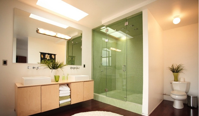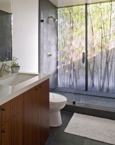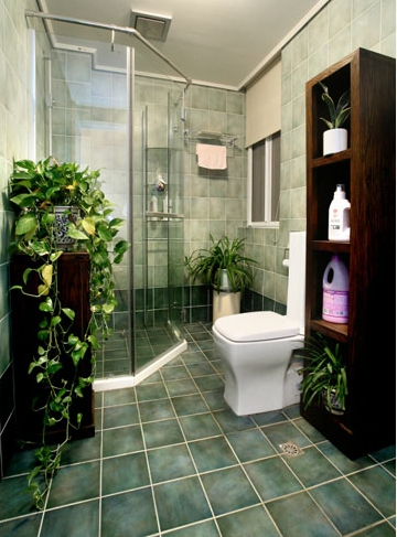 这个卫生间不但采用了田园风情的瓷砖,还在卫浴间内安置了许多新鲜的绿植,让整个卫浴间包括淋浴房都充满了自然清新的味道。