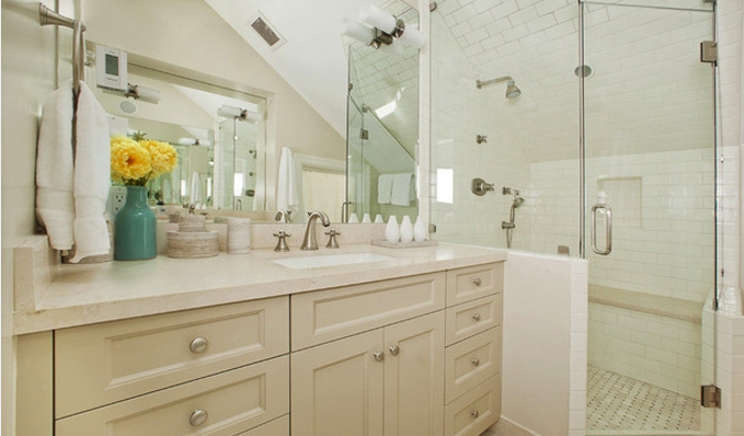 这个清新亮白的阁楼卫浴则更加亮眼,半玻璃半实体墙的隔断多了一分设计感,让淋浴房变得更加结实与时尚。