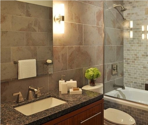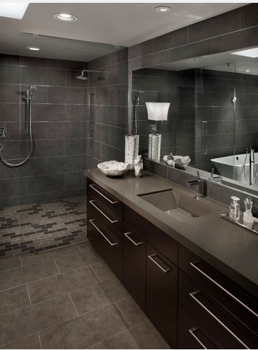 深色的瓷砖和浴室柜让这个卫生间充盈着一种让人觉得安静的魔力,同时也有着时尚利落的质感,强烈的视觉作用下千万不要不小心撞上透明玻璃门哦!